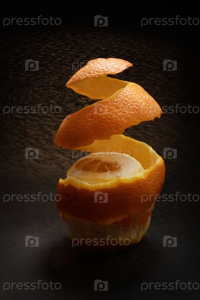 Апельсин с очищенной спиральной кожей на темном фоне
