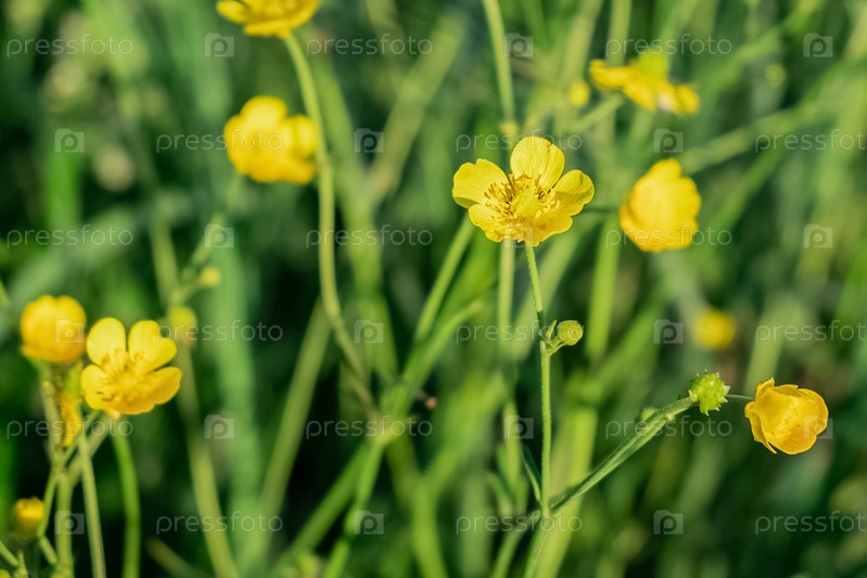 Желтый цветок шерстистого лютика на зеленой траве размытым фоном