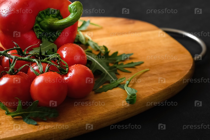 Красные спелые свежие помидоры черри на ветке, перец и зеленая руккола на деревянной разделочной доске. Здоровое питание и диета