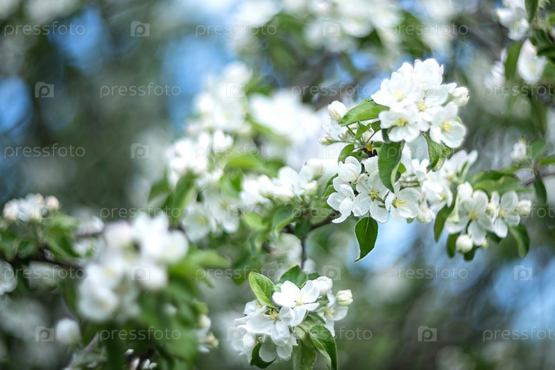 Цветущие белые цветы яблони в весеннем саду на фоне голубого неба