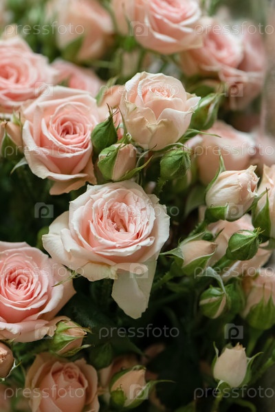 Букет свежесрезанных розовых роз, цветочный фон