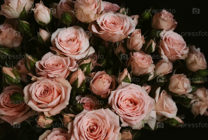 Букет свежих цветущих розовых роз на темном фоне