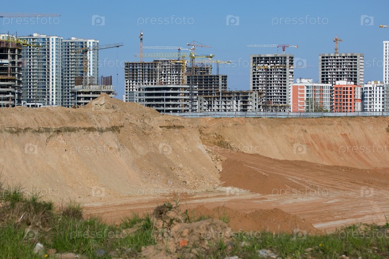 Строительная площадка. Железобетонные каркасы многоэтажных домов и строительных кранов. На фоне голубого неба