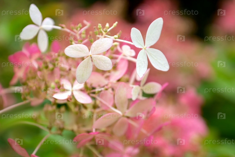Цветы гортензии с четырьмя лепестками на размытом фоне крупным планом