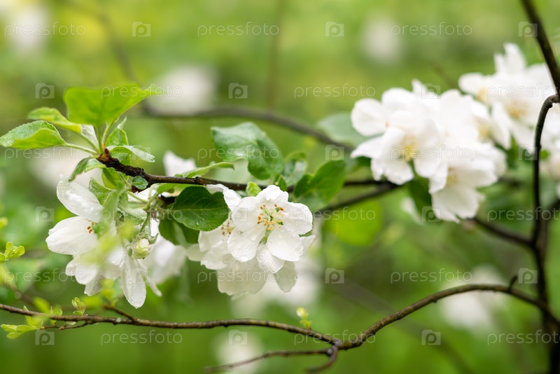 Цветущая ветка яблони с белыми цветами в весеннем саду