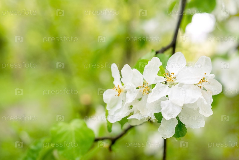 Цветущая ветка яблони с белыми цветами в весеннем саду крупным планом