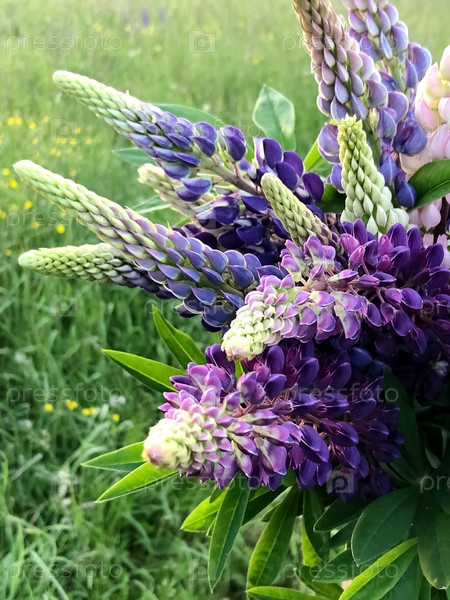 Букет фиолетовых цветов люпина на фоне зеленой травы в летнем поле