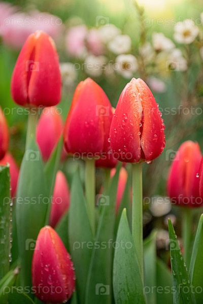Бутоны красных тюльпанов со свежими зелеными листьями в мягком свете на размытом цветочном фоне