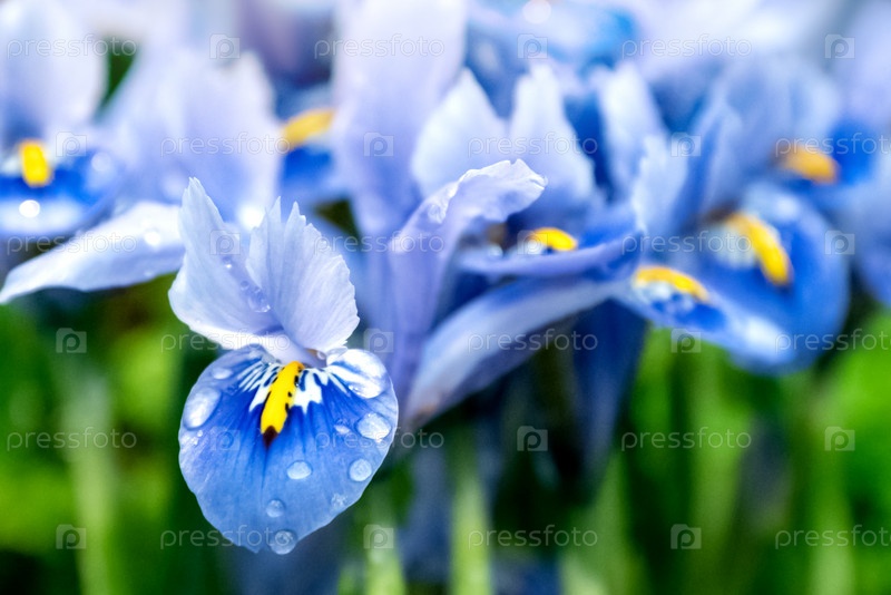Синие лепестки ириса с каплями росы на цветочном фоне