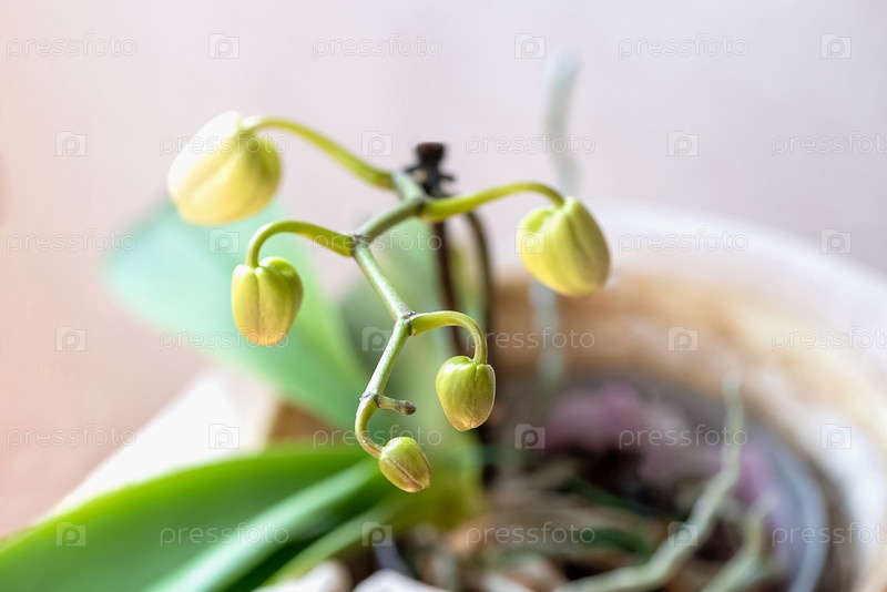 Крупный план бутонов орхидеи фаленопсис на стебле. Теплица, комнатное растение, экзотические цветы дома