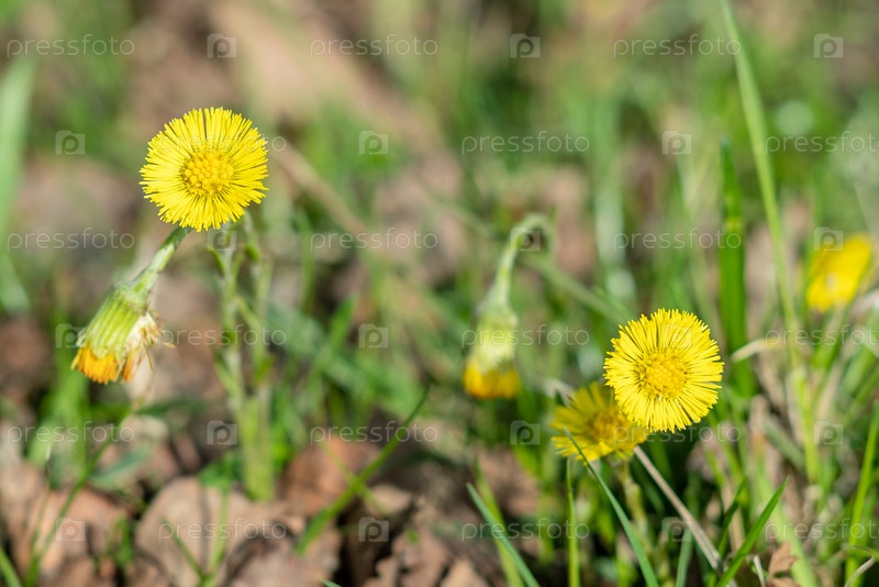 Желтые цветы Туссилаго цветут в зеленой траве весной