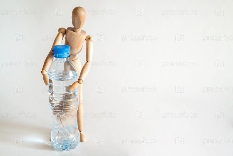 Деревянный манекен держит пластиковую бутылку с водой на светлом фоне