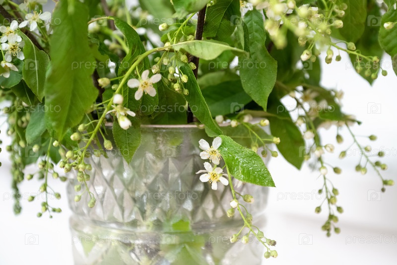 Ветви цветущей черемухи в стеклянной вазе крупным планом