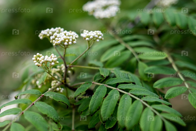 Белые бутоны обыкновенной рябины, зеленые. листья, выборочный фокус