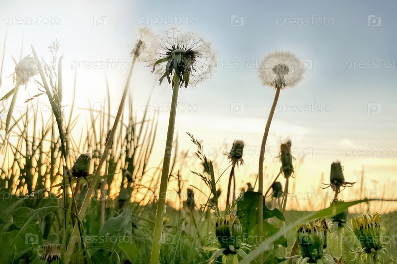 Луг белых пушистых цветов одуванчика на фоне закатного неба