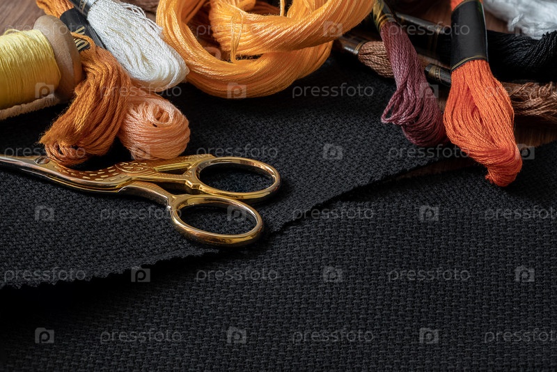 Набор для вышивания на столе - черная канва, мотки с нитками мулине и ножницы