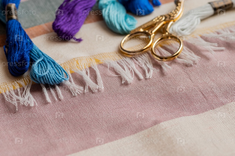 Мотки с нитками мулине и ножницами на поверхности ткани. Хобби и отдых, вышивальное оборудование, концепция «сделай сам»