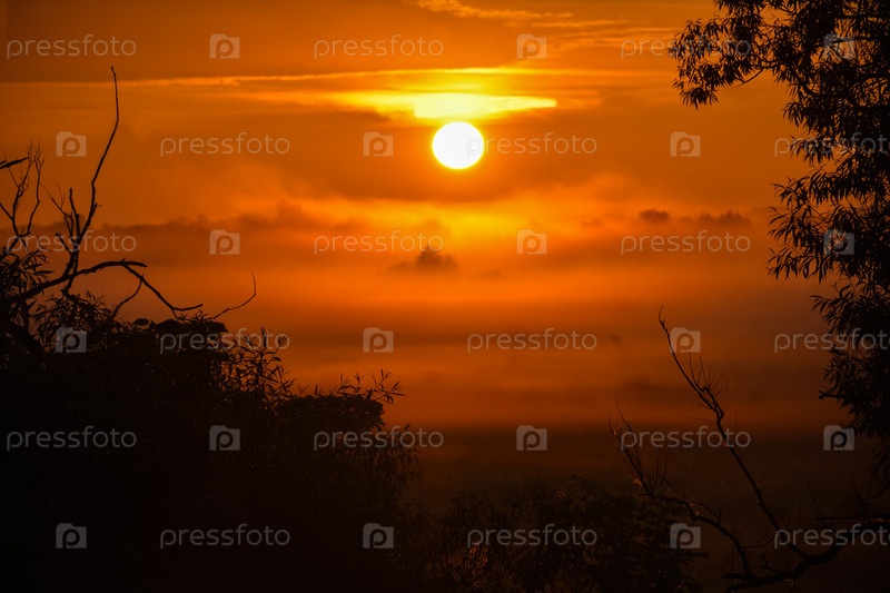 Оранжевый восход солнца с туманами в лесу. силуэты деревьев на рассвете