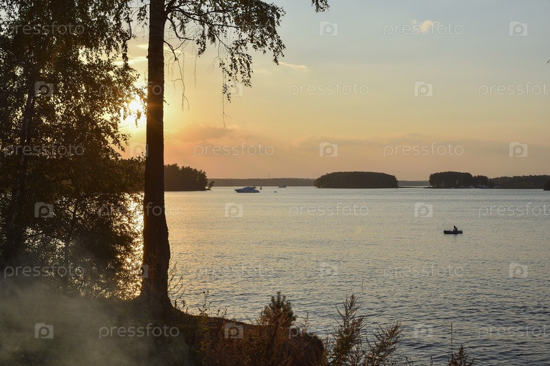 Закат на озере, силуэт березы