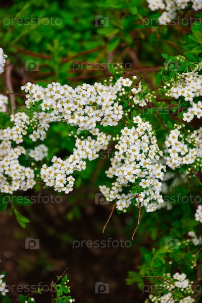 Белые цветы спиреи крупным планом