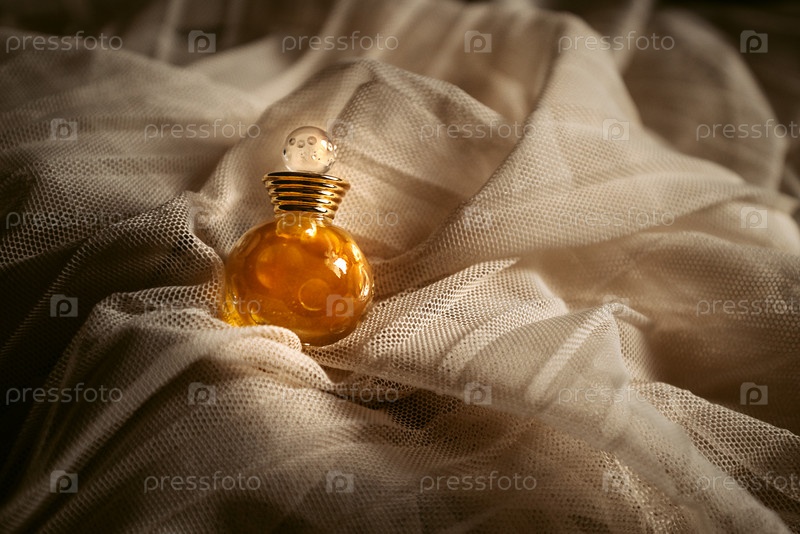 Флакон духов на задрапированном текстильном фоне