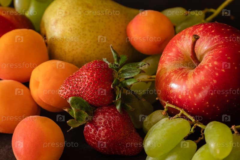 Фруктовый ассортимент свежих фруктов - виноград, клубника, абрикосы, груши, яблоки - на черном фоне