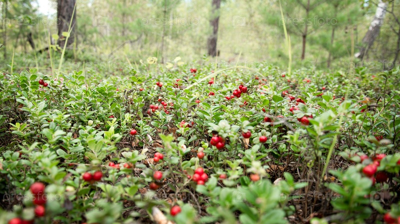 Большой лесной луг, покрытый зелеными небольшими кустами брусники с красными спелыми ягодами