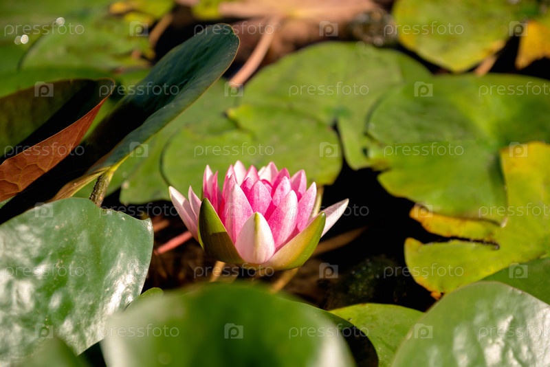 Цветущая розовая кувшинка, плавающая в озерной воде среди зеленых листьев