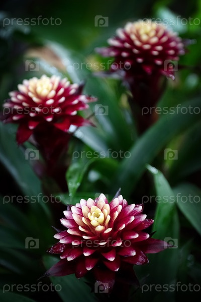 Цветки розовой бромелии Guzmania в полном цвете на фоне темно-зеленых листьев.Цветящее экзотическое эпифитное растение