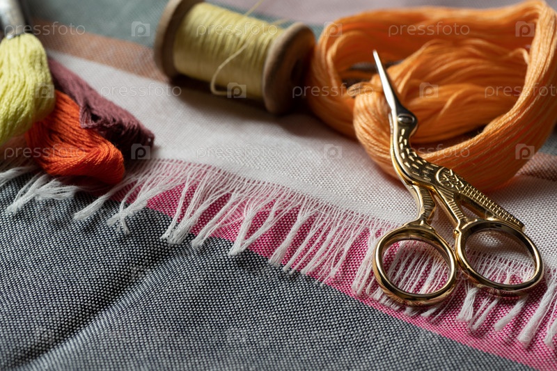 Различное вышивальное оборудование на столе - ткань, мотки с нитками мулине и ножницы