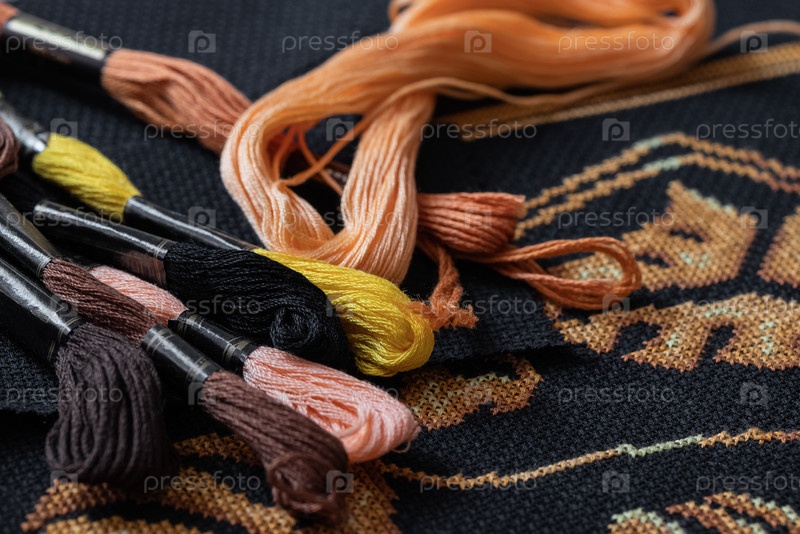 Разноцветные мотки с нитками мулине, разбросанными по черному холсту, покрытому вышивкой крестиком