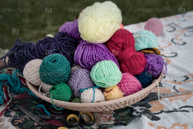 Плетеная корзина с разноцветными клубками из шерстяной пряжи для вязания спицами