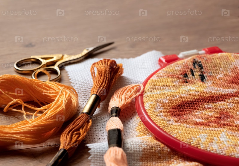 Канва с вышитым крестиком заправлена в пяльцы, рядом лежат разноцветные нитки мулине и ножницы. Вышивка крестом, хобби и отдых, концепция "сделай сам"