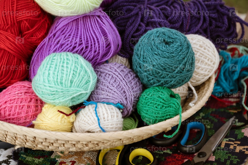 Плетеная корзина с разноцветными клубками из шерстяной пряжи для вязания спицами