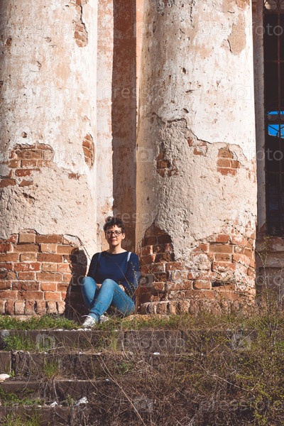 Девушка в очках сидит на фоне заброшенного здания, заброшенной церкви