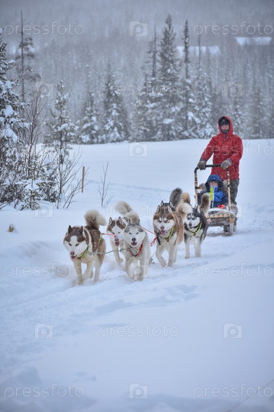 Собачья упряжка хаски везет сани с людьми в заснеженном лесу