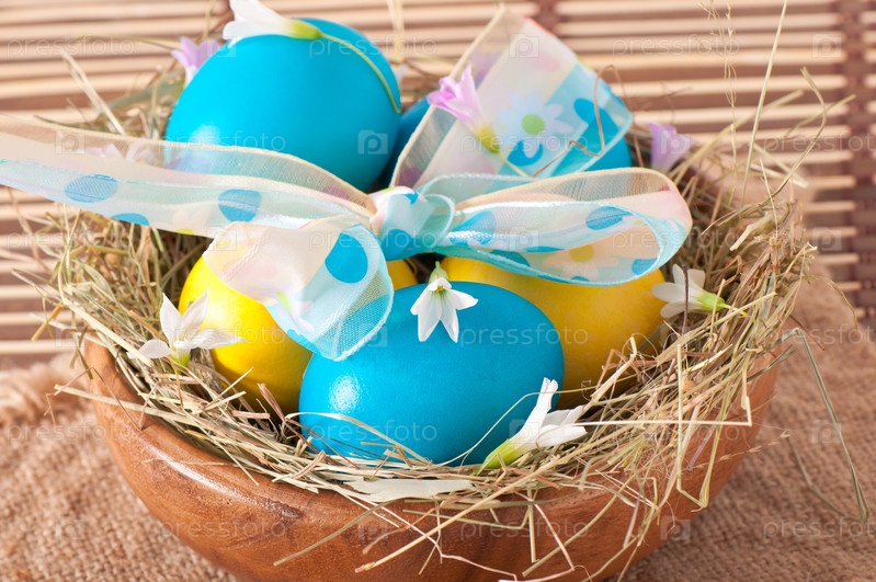 Пасхальные яйца в гнезде на деревянном фоне