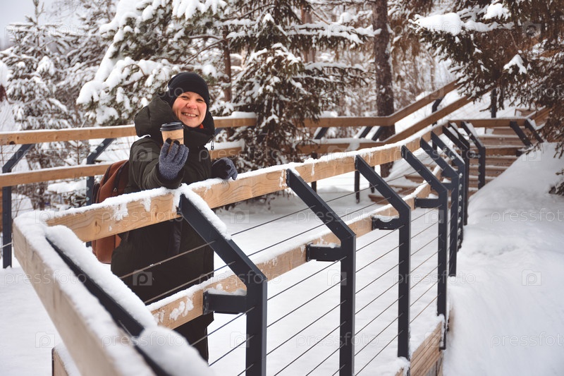 Девушка стоит на мосту и смотрит на зимний пейзаж