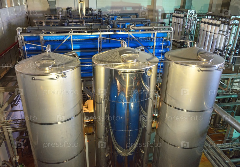 Промышленное оборудование в мастерской пивоварни, резервуары для дистиллированной воды в пивоварне