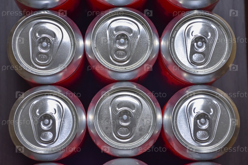 Алюминиевые банки, вид сверху, пивные банки закрыты, много пивных алюминиевых банок