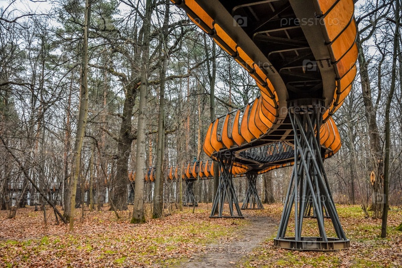 Воздушный экотропический парк на ВДНХ, деревянная дорожка в осеннем лесу, экотропический парк, воздушная тропа