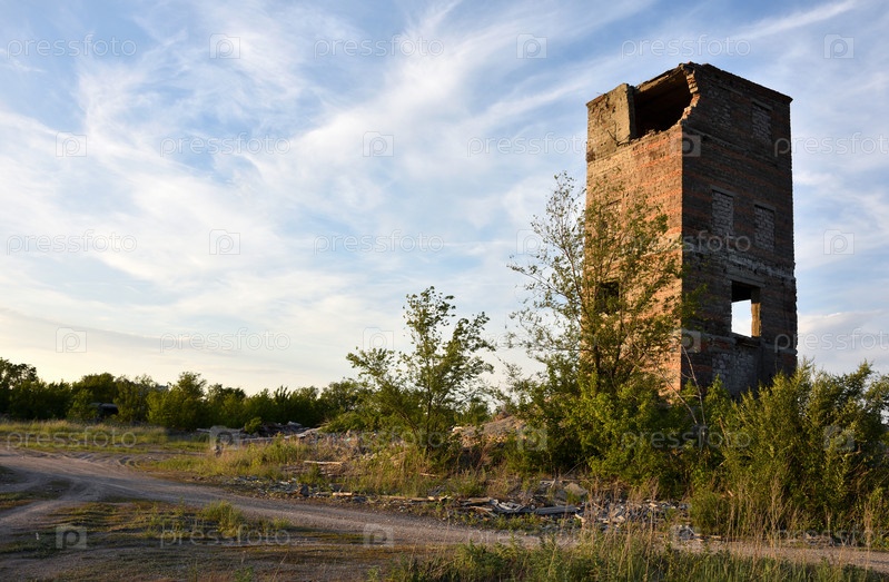 Заброшенное здание завода, разрушенная башня