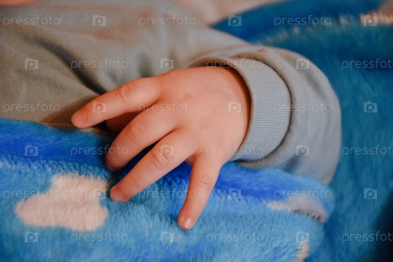 Маленькая детская рука на голубом одеяле