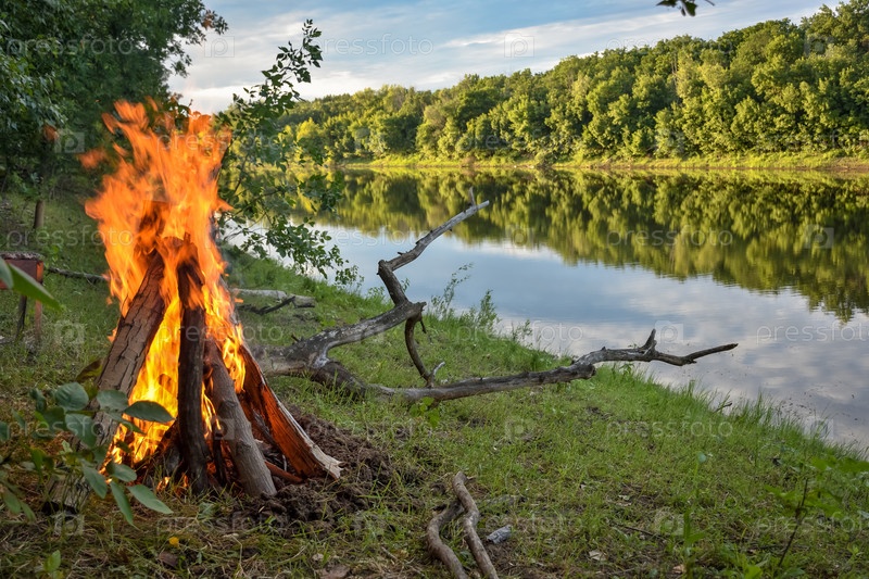 Костер на фоне реки и леса
