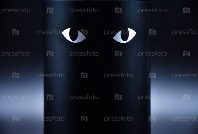 Два нарисованных глаза на черном фоне. два кошачьих глаза, нарисованные на черном фоне на алюминиевой банке
