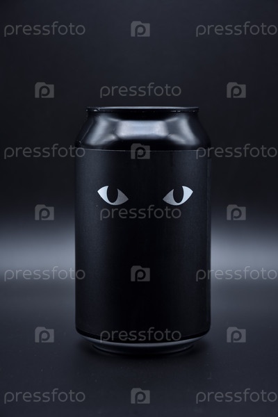 Два нарисованных глаза на черном фоне. два кошачьих глаза, нарисованные на черном фоне на алюминиевой банке