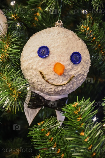 Елочная игрушка снеговик с бабочкой висит на ветке