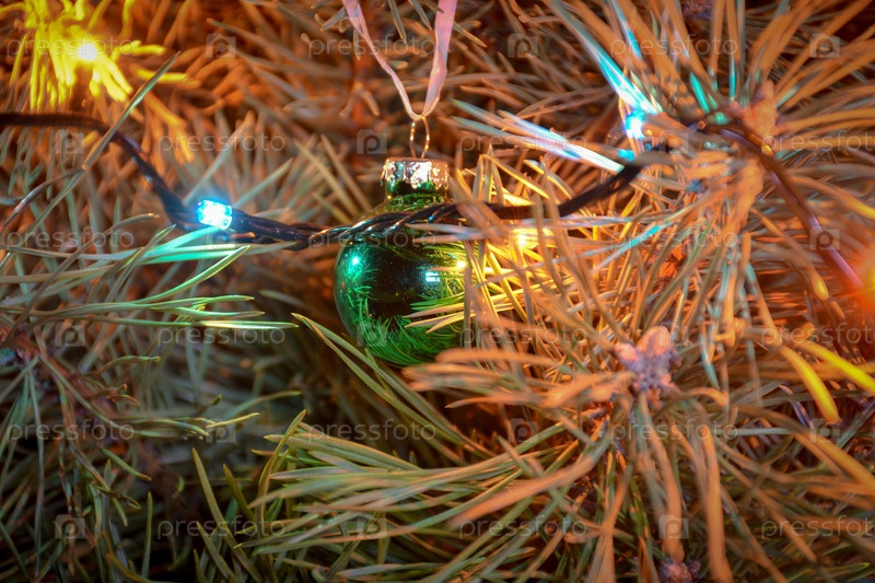 Елочная игрушка на ветке крупным планом