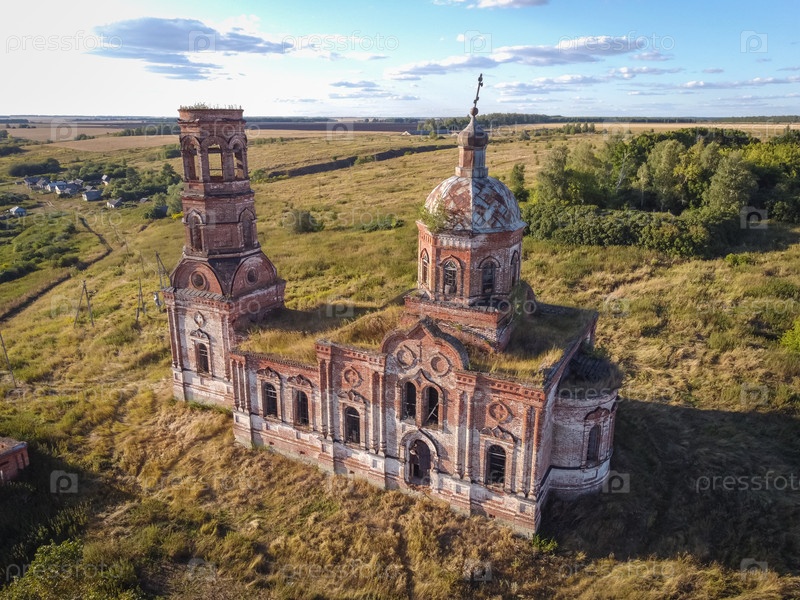 Полет над заброшенной церковью, древняя заброшенная и разрушенная церковь, полуразрушенный храм из красного кирпича