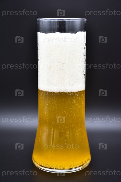 Стеклянная колба на черном фоне с желтой жидкостью и белой пеной, стакан пива на черном фоне